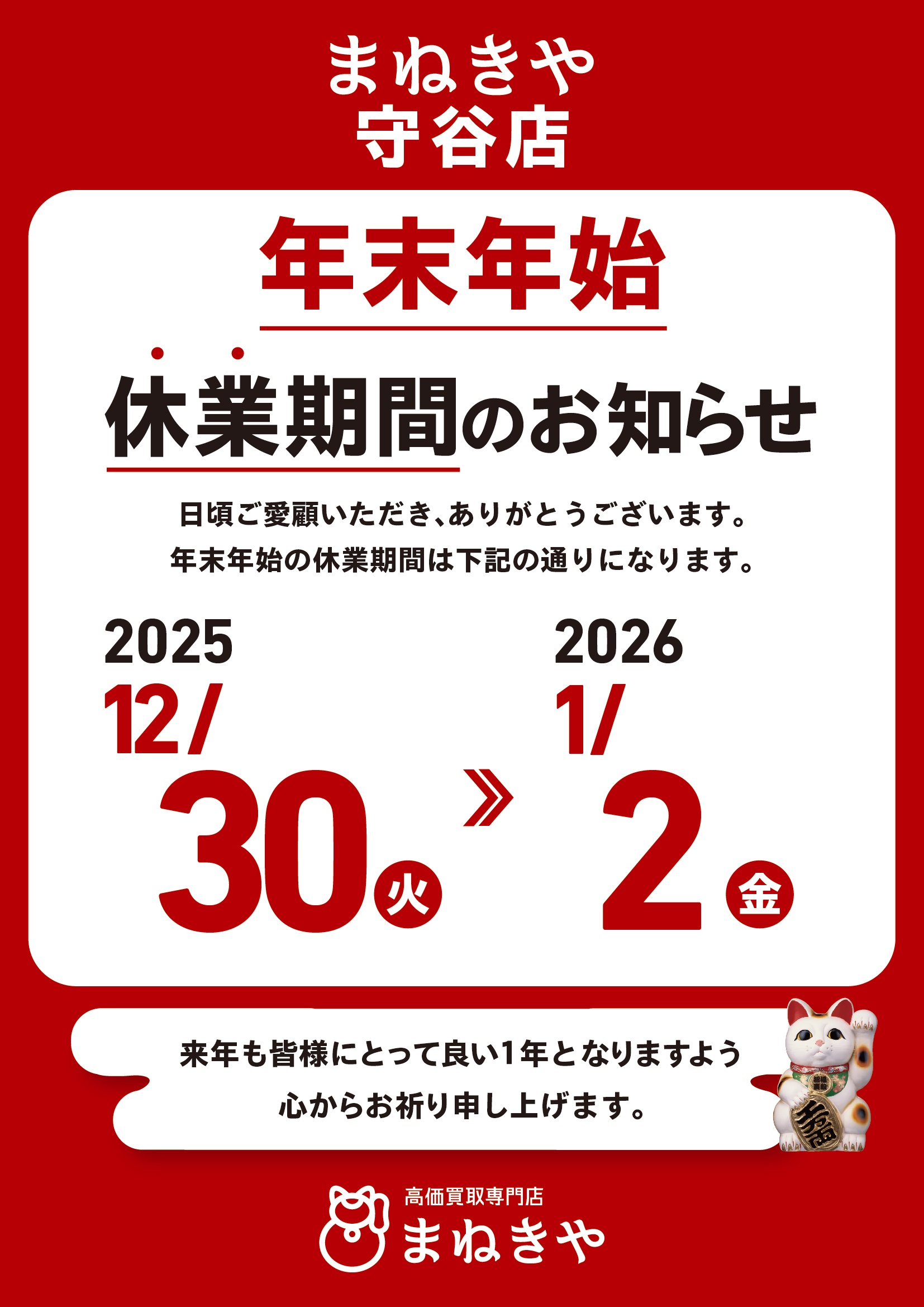 年末年始の休業のお知らせ【まねきや 西友楽市守谷店】